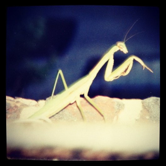 I’ve been seeing a lot of praying mantis’ again lately. Some basic internet research tells me that the praying mantis is thought to bring good luck and is a symbol of stillness in most cultures, appearing when we’re in need of peace and quiet. “The mantis never makes a move unless she is 100% positive it is the right thing for her to do. This is a message to us to contemplate and be sure our minds and souls all agree together about the choices we are making in our lives.” Well. Okay. Shit. That sounds complicated. Maybe I’ll think about that tomorrow.